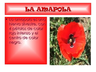 Este documento presenta información sobre diferentes tipos de flores, incluyendo la amapola, margarita, rosa, albahaca, clavel, magnolia, violeta, alelí, anémona, campanilla, hortensia, jacinto, ciclamen y geranio. Describe las características de cada flor como su color, temporada de floración y uso común.