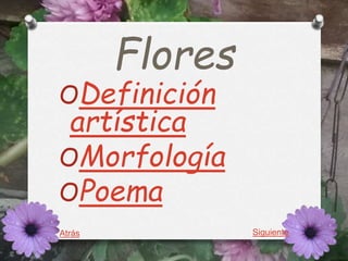 El documento habla sobre las flores y cómo han inspirado a artistas por siglos debido a su simbolismo natural. Luego presenta un poema de 4 estrofas donde un artista describe el proceso de pintar una rosa perfecta, pétalo por pétalo, pero al día siguiente se da cuenta que su creación perfecta ya estaba muerta.