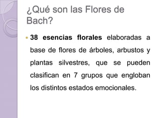 El documento describe el sistema de terapia floral creado por el médico inglés Edward Bach entre 1926 y 1934. Consiste en 38 esencias florales que se pueden clasificar en 7 grupos relacionados con diferentes estados emocionales. Cada flor se usa para tratar un estado emocional específico. El documento explica cómo preparar y tomar las flores de Bach, así como los estados emocionales asociados con cada flor.