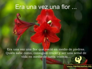 Una flor nació en un lugar inhóspito y atrajo la atención de varias personas, cada una con diferentes reacciones hacia ella. Mientras que una joven la cortó y la llevó a la iglesia, otra persona simplemente la agradeció y la dejó intacta, pero ambos acabaron perdiéndola. Sin embargo, una niña decidió cuidar de la flor y, a través de su atención, transformó el área de piedras en un jardín, simbolizando el cultivo de la amistad.