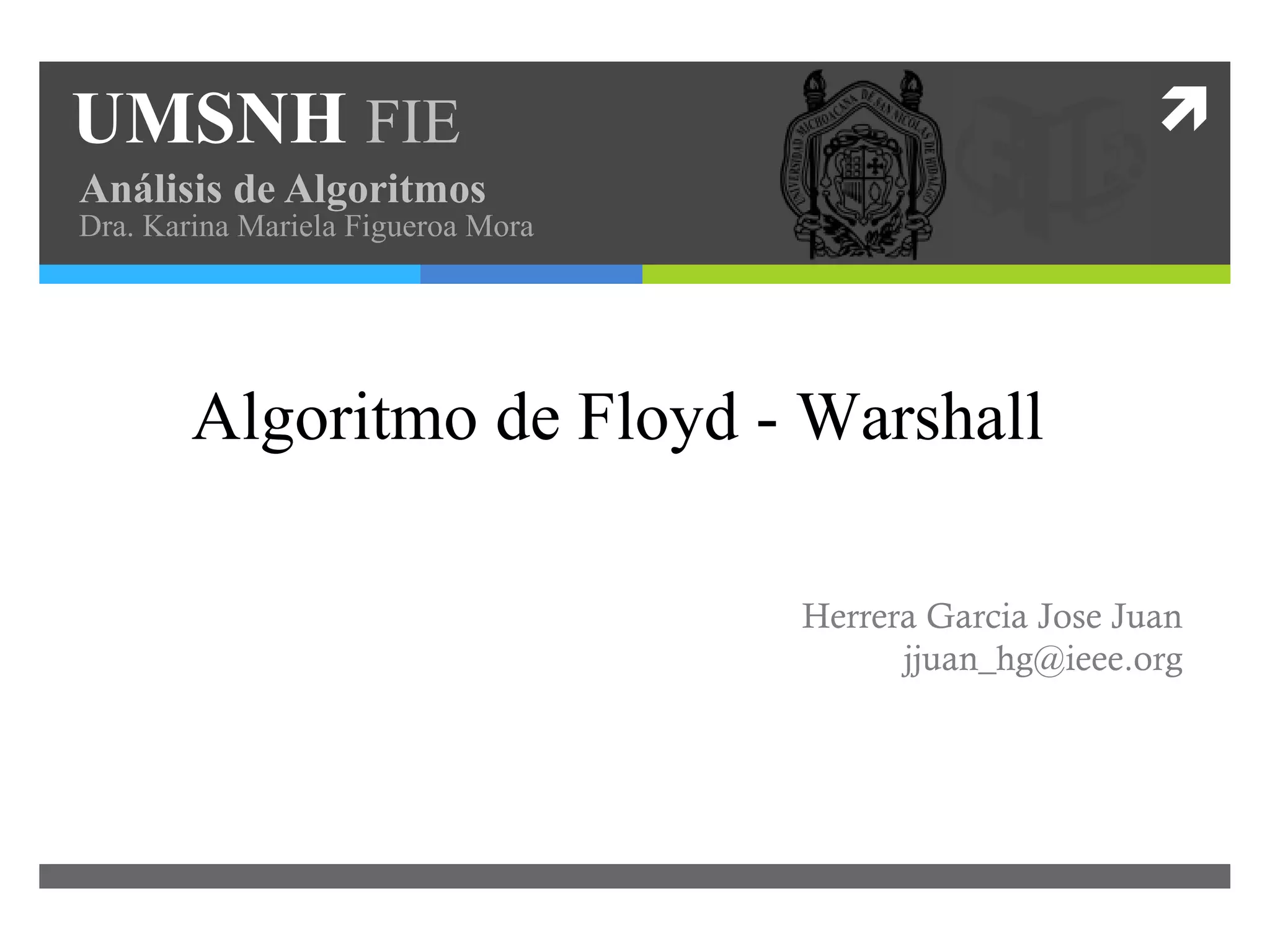 El documento describe el algoritmo de Floyd-Warshall para encontrar el camino más corto entre todos los pares de nodos en un grafo. Se aplica al problema de una empresa con 7 bodegas distribuidoras de aguacate que desea saber el costo mínimo de transporte entre cada par de bodegas. El algoritmo toma como entrada una matriz de adyacencia y mantiene una matriz actualizada con las distancias mínimas entre nodos, resultando en una matriz final con los caminos más cortos. La complejidad del algoritmo es O(N3) donde N es el número de nod