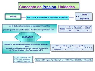 El documento trata sobre conceptos básicos de fluidos estáticos como la presión, unidades de presión, ecuación fundamental de la hidrostática, transmisión de la presión, principio de Arquímedes y equilibrio de sólidos sumergidos. Explica que la presión en un fluido depende de la profundidad, se transmite uniformemente y es igual en puntos de la misma altura. También describe cómo los sólidos se hunden, flotan o permanecen en equilibrio dependiendo de si su densidad es mayor, menor o igual a la del fluid