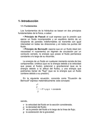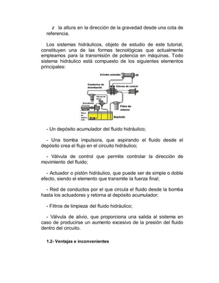 Este documento describe los fundamentos y componentes básicos de los sistemas hidráulicos. Explica los principios de Pascal y Bernoulli, en los que se basa la hidráulica. Detalla los componentes clave como la bomba, válvulas, actuadores, conductos y depósito. Además, analiza los fluidos hidráulicos comúnmente utilizados y sus propiedades, incluida la viscosidad. Finalmente, explica las funciones del depósito hidráulico como almacenamiento del fluido y disipador de calor.