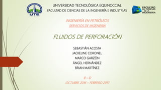 Este documento describe los fluidos de perforación, incluyendo sus funciones, propiedades, tipos, sistemas de circulación y pruebas. Los fluidos de perforación se utilizan en la perforación de pozos y cumplen funciones como transportar ripios, enfriar y lubricar. Existen diferentes tipos como lodos de base agua o aceite. El sistema de circulación incluye el área de preparación, equipo y acondicionamiento. Se realizan pruebas para monitorear propiedades como densidad, viscosidad y pH.