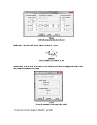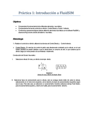 Este documento presenta una práctica de introducción al software FluidSIM para simular circuitos neumáticos. Explica cómo construir circuitos que utilizan control directo e indirecto de cilindros neumáticos y cómo implementar funciones lógicas básicas como AND, OR, NOT y XOR usando elementos neumáticos. La práctica guía al usuario paso a paso a través de la construcción y simulación de estos circuitos neumáticos virtuales para comprender mejor el flujo de aire y cómo lograr diferentes operaciones lógic