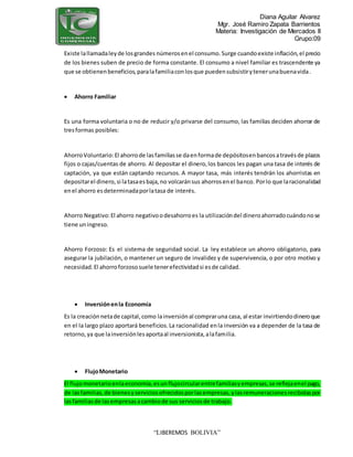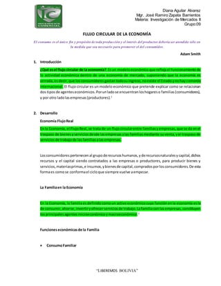 El documento describe el flujo circular de la economía, un modelo que explica la relación entre familias (consumidores) y empresas (productores). Las familias venden sus servicios a las empresas y reciben ingresos que gastan en consumir los bienes y servicios producidos por las empresas. Este flujo circular entre familias y empresas se repite continuamente formando un ciclo. El modelo ilustra cómo funciona el intercambio monetario y de bienes entre consumidores y productores en una economía.
