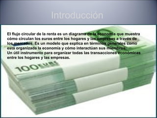 El documento describe el flujo circular de la renta, que muestra cómo circulan los euros entre los hogares y las empresas a través de los mercados de bienes y servicios y de factores de producción. Los hogares poseen los factores de producción y consumen los bienes y servicios, mientras que las empresas producen bienes y servicios utilizando factores de producción. El sector público actúa como empresa y hogar en el flujo circular al demandar factores e intercambiar bienes y servicios, y recauda impuestos para financiar bienes públicos.