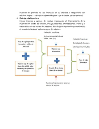 Este documento describe los diferentes tipos de flujos de caja que se pueden identificar en un proyecto. Explica que el flujo de caja operaivo se obtiene de los ingresos y egresos durante la vida útil del proyecto, mientras que el flujo de caja de capital considera la inversión y recuperación de capital. También describe el flujo de caja económico y financiero, este último incluye los ingresos y egresos relacionados al financiamiento con capital de terceros.