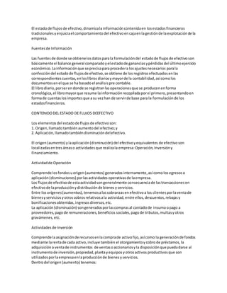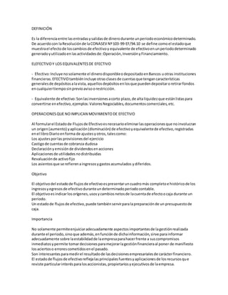 El documento define el estado de flujos de efectivo como un estado financiero que muestra los orígenes y usos de efectivo de una empresa durante un período. Presenta la información agrupada en tres actividades: operación, inversión y financiamiento. El objetivo es mostrar los cambios en el efectivo de la empresa y evaluar su gestión financiera. La información para su elaboración proviene de los estados financieros tradicionales y registros contables.