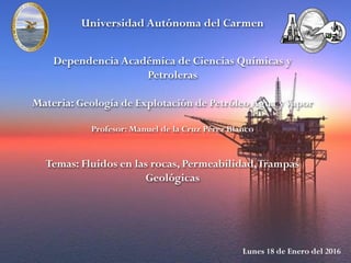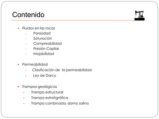 Este documento presenta información sobre tres temas clave relacionados con la geología de explotación de petróleo: fluidos en las rocas, permeabilidad y trampas geológicas. Se define la porosidad, saturación y compresibilidad de las rocas y se describen los diferentes tipos de flujo de fluidos. También se explican los conceptos de permeabilidad y las diferentes trampas geológicas que pueden retener hidrocarburos. El objetivo es evaluar los intervalos atractivos para la acumulación de hidrocarburos y