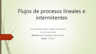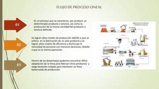 Este documento compara y contrasta los flujos de procesos lineales e intermitentes. Un proceso lineal se caracteriza por producir cantidades constantes de un solo producto de manera eficiente, mientras que un proceso intermitente produce diversos productos en respuesta a la demanda y permite más flexibilidad y variedad pero con menor productividad. Ambos procesos tienen ventajas y desventajas dependiendo del tipo de producción requerida.