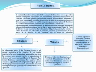 El documento proporciona información sobre el estado de flujo de efectivo. Explica que este estado muestra los flujos de efectivo de una empresa por actividades de operación, inversión y financiamiento durante un período. También describe los métodos directo e indirecto para preparar el estado de flujo de efectivo y explica conceptos como actividades operativas, de inversión y financiamiento.