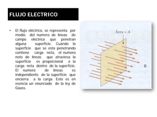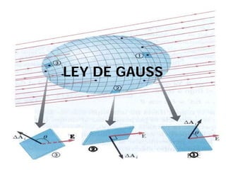 La ley de Gauss establece que el flujo eléctrico total a través de una superficie cerrada es igual a la carga eléctrica total encerrada dividida por la permitividad del vacío. El documento explica esta ley y presenta varios ejemplos de su aplicación al calcular el flujo eléctrico a través de diferentes superficies debido a cargas puntuales y distribuidas.