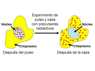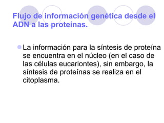 El documento describe el flujo de información genética desde el ADN hasta las proteínas. Explica que la información genética se encuentra en el núcleo pero la síntesis de proteínas ocurre en el citoplasma. Describe el experimento de pulso y caza que demostró que el ARN se produce en el núcleo y luego se transporta al citoplasma para transmitir la información genética a las proteínas. Finalmente, explica brevemente la diferencia entre ADN y ARN y cómo los retrovirus insertan su ARN en el ADN de la cé