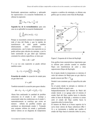 El documento presenta un análisis del flujo de Rayleigh y el flujo isotérmico en ductos, centrándose en la caracterización de flujos compresibles, la transferencia de calor y su relación con las leyes de la termodinámica. Se derivan ecuaciones relevantes y se describen fenómenos como el cambio de Mach, la variación de entropía y el comportamiento en condiciones supersónicas y subsónicas. El estudio concluye que los flujos de Rayleigh en condiciones supersónicas son más eficientes en términos de variación de entropía y consumo de energía en comparación con flujos subsónicos.