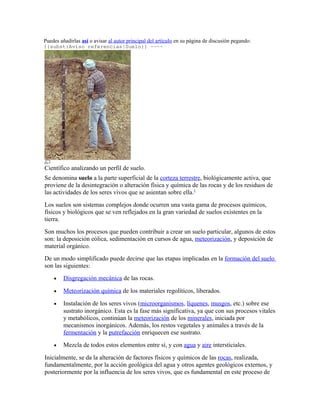 Este documento describe el proceso de formación de los suelos. Inicialmente, las rocas son disgregadas mecánicamente y meteorizadas químicamente, creando un manto de alteración. Luego, los seres vivos como microorganismos y plantas se instalan y continúan el proceso de meteorización, enriqueciendo el sustrato con materia orgánica. Finalmente, a través de procesos físicos, químicos y biológicos se diferencian horizontes en el perfil del suelo y se forman diferentes tipos de suelo