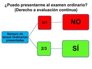 Este documento describe los requisitos para tener derecho a los exámenes ordinario y extraordinario. Para tener derecho al examen ordinario, un estudiante debe haber presentado al menos 2 o 3 tareas ordinarias. Para tener derecho al examen extraordinario, un estudiante debe haber presentado tareas extraordinarias si no pudo presentarse al examen ordinario, o haber presentado al menos un bloque de tareas ordinarias.