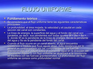 Este documento describe las principales ecuaciones utilizadas para modelar el flujo uniforme en canales abiertos y tuberías, incluyendo las ecuaciones de Chézy, Manning, Hazen-Williams, Darcy-Weisbach y Colebrook-White. Explica los conceptos fundamentales del flujo uniforme y cómo cada ecuación relaciona parámetros como la velocidad, pendiente, rugosidad y diámetro para modelar la resistencia al flujo.