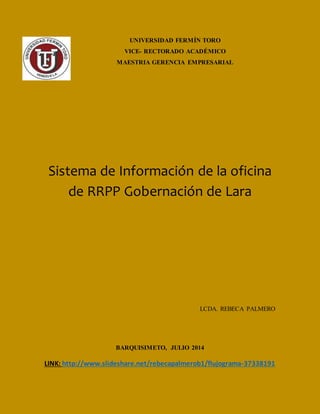 El documento describe el sistema de información de la oficina de relaciones públicas de la Gobernación de Lara. La oficina planifica eventos y convocatorias que son revisadas y analizadas por un comité técnico. El comité puede modificar las convocatorias antes de publicarlas y difundirlas. El proceso se repite hasta que el comité aprueba una convocatoria.