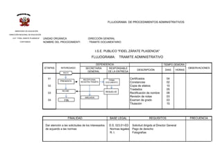 El flujograma describe el proceso administrativo para trámites documentarios en el Instituto Público "Fidel Zárate Plasencia". El interesado presenta su solicitud a la secretaría general, quien la registra y la remite al responsable de la entrega para su resolución en un plazo de 4 a 15 días. Una vez resuelta, el documento se archiva, concluyendo así el trámite.