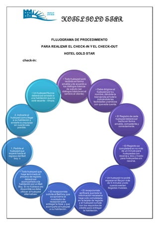 Este documento presenta los procedimientos de check-in y check-out en el Hotel Gold Star. Para el check-in, los huéspedes serán recibidos amablemente y se les dará la bienvenida al hotel. Se completará el registro en menos de un minuto para huéspedes con reserva y en dos minutos y medio para los que no tienen reserva. Una vez finalizado el registro, un botones acompañará al huésped a su habitación. Para el check-out, la hora límite es el mediodía. Se permitirán salidas tardías previa consulta y anot