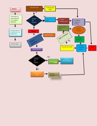 El documento describe el funcionamiento de un dispensador de jugos refrigerado con 3 sabores diferentes (agua, banano y leche). Explica que asigna agua al botón 1, banano al 2 y leche al 3. Luego detalla varias transacciones de clientes comprando diferentes vasos y tamaños de jugos y la máquina despachando las cantidades correspondientes.