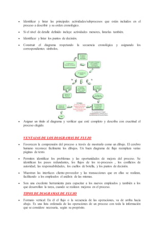 Este documento describe los flujogramas o diagramas de flujo, que son gráficos que representan el movimiento o curso de un proceso o actividad. Explica que los flujogramas son importantes para representar procedimientos de manera clara. También describe los símbolos, características, ventajas y tipos de diagramas de flujo, así como herramientas para crearlos. Finalmente, incluye un ejemplo de diagrama de flujo realizado con el software Nevron Diagram Designer.