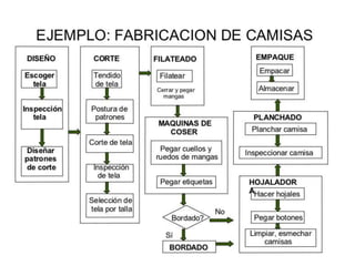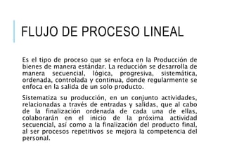 Este documento describe dos tipos de flujos de procesos: lineales e intermitentes. Los procesos lineales se enfocan en la producción estándar de bienes de manera secuencial y continua. Por ejemplo, la fabricación de neumáticos. Los procesos intermitentes producen medianos o bajos volúmenes de manera irregular y flexible, permitiendo variar actividades o producir diferentes productos usando la misma infraestructura. Se comparan ambos procesos, destacando que los lineales logran altos volúmenes de producción de manera