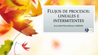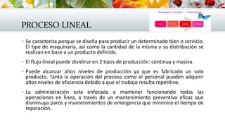 El documento describe dos tipos de flujos de procesos: lineales y intermitentes. Los procesos lineales se caracterizan por producir un solo producto de forma continua y masiva, logrando altos niveles de producción y eficiencia. Los procesos intermitentes producen lotes de productos de forma flexible pero irregular, lo que requiere mayor destreza pero permite mayor variedad de productos.