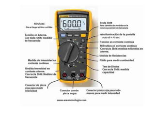 El fluke es un multímetro o polímetro muy usado por profesionales para medir voltajes, intensidades, resistencias y comprobar diodos y transistores. Tiene un selector para cambiar entre mediciones y botones para alternar entre mediciones similares. Las pinzas se conectan a los agujeros en la parte inferior, usando siempre la pinza negra en el del medio y la roja en el de la derecha, excepto para medir corriente alterna. El display muestra las mediciones realizadas.