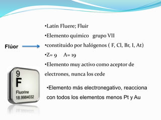 Este documento resume la información sobre el flúor, incluyendo su composición química, fuentes naturales, efectos en la salud dental y esquelética, y métodos de aplicación tópica. El flúor es un halógeno que se ha demostrado que reduce la incidencia de caries al integrarse en el esmalte dental y fortalecerlo contra la desmineralización. La fluoración del agua y el uso de dentífricos y enjuagues fluorados son estrategias efectivas de prevención de caries. Sin embargo, altas dosis de