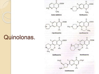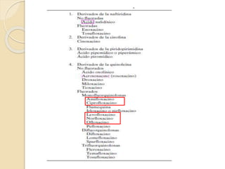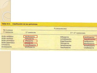 El documento aborda el uso de fluoroquinolonas, su mecanismo de acción sobre la DNA girasa y topoisomerasa IV en bacterias, y su eficacia contra diversas infecciones bacterianas. También se detallan las indicaciones, dosificaciones, contraindicaciones y efectos adversos de varios medicamentos como ciprofloxacino, ofloxacino y levofloxacino. Finalmente, se mencionan casos específicos de tratamiento y referencias bibliográficas para profundizar en el tema.