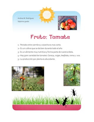 El documento describe las características del tomate, incluyendo que tiene un corto período de siembra a cosecha, se cultiva durante todo el año, es nutritivo y parte de nuestra dieta, y existe gran variedad como cereza, rutger, beeftake, roma y uva, con una producción abundante por planta.