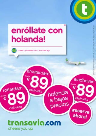 El documento anuncia vuelos baratos de la aerolínea Transavia a varias ciudades holandesas como Róterdam, Ámsterdam y Eindhoven desde 89 euros ida y vuelta durante el periodo del 9 de abril al 1 de julio de 2013. También promueve los atractivos turísticos de Holanda como los jardines de tulipanes de Keukenhof, los canales históricos de Ámsterdam, pasear en bicicleta por los molinos de Kinderdijk y visitar fábricas de porcelana azul en