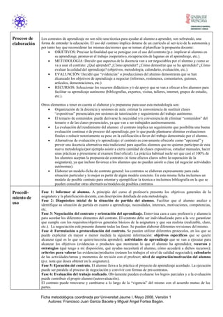El documento describe el método de contrato didáctico o de aprendizaje, donde el profesor y el alumno negocian explícitamente sus objetivos, actividades y formas de evaluación para el proceso de enseñanza-aprendizaje. Esto permite una mayor autonomía del alumno y una educación más personalizada. El documento explica las fases de implementación de este método, sus variantes y beneficios, así como un ejemplo de contrato.