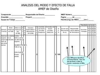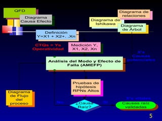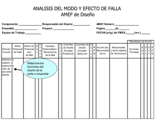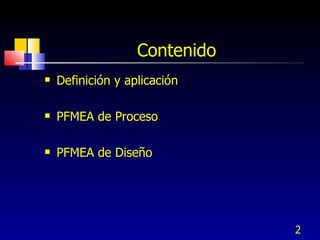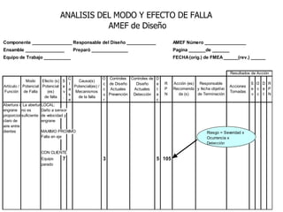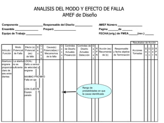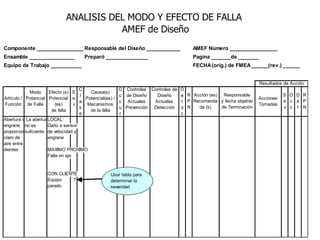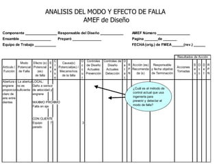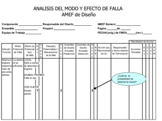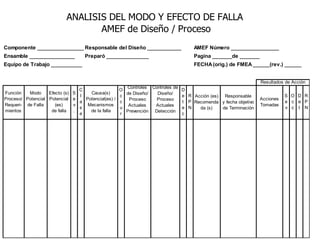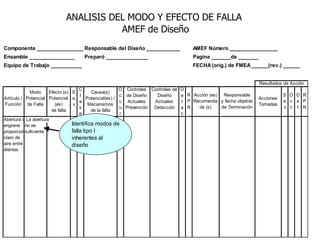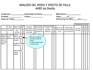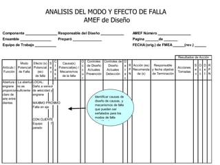 El documento habla sobre el análisis del modo y efecto de falla (FMEA). Explica que el FMEA identifica fallas potenciales, sus efectos y acciones para reducirlas. También diferencia entre FMEA de diseño y de proceso. Luego describe los pasos para realizar un FMEA de proceso, incluyendo definir los pasos del proceso, modos de falla, efectos, causas probables y controles.