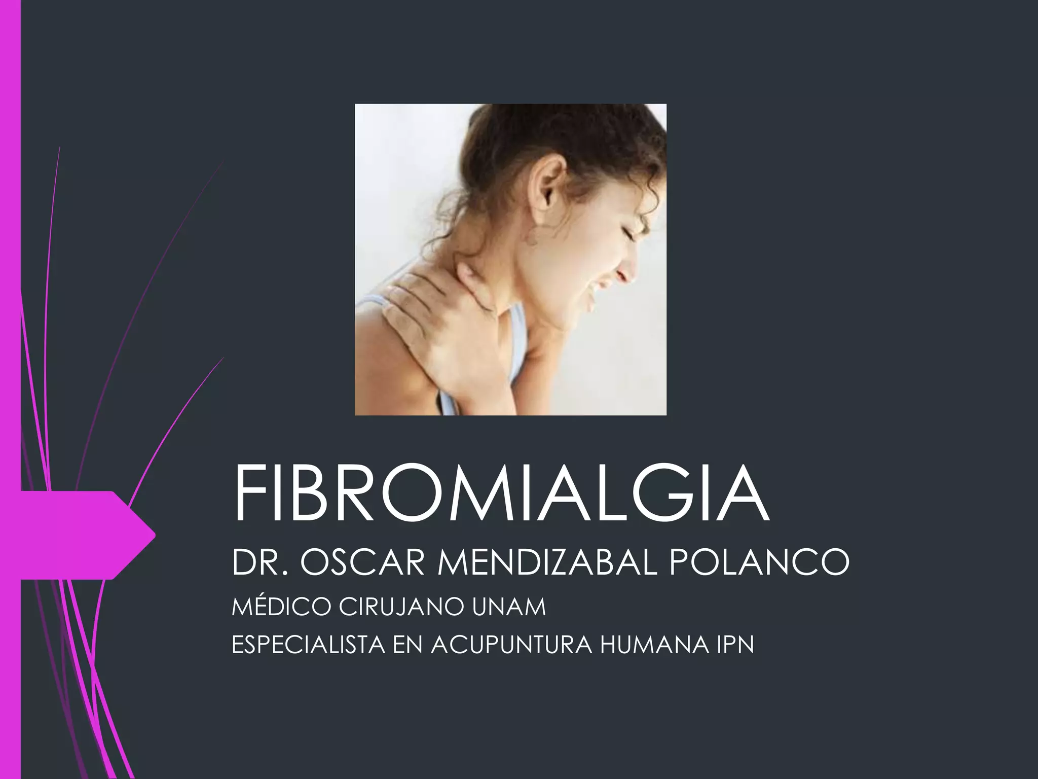 La fibromialgia es un síndrome clínico definido por dolor generalizado, fatiga, alteraciones del sueño y síntomas somáticos variables. Afecta del 2-5% de la población y es más común en mujeres entre 20 y 50 años. Se cree que factores genéticos, neuroendocrinos y ambientales contribuyen a su desarrollo. El tratamiento incluye fármacos para controlar síntomas y terapias no farmacológicas como ejercicio, terapia cognitiva y acupuntura, la cual inhibe la vía