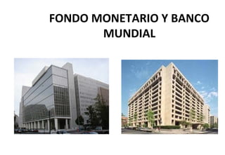 El documento detalla la estructura y funciones del Fondo Monetario Internacional (FMI) y el Banco Mundial, destacando que el FMI se creó en 1944 para promover la estabilidad monetaria y facilitar el comercio internacional, mientras que el Banco Mundial se enfoca en brindar asistencia al desarrollo para los países más pobres. Ambas organizaciones han evolucionado a lo largo del tiempo, aumentando su membresía y funciones, pero enfrentan críticas sobre su enfoque en el crecimiento económico y sus prioridades. El FMI presta dinero con condiciones para corregir problemas económicos, y el Banco Mundial otorga créditos y donaciones para impulsar el desarrollo económico.