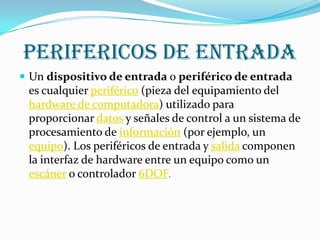 Este documento clasifica y describe varios tipos de periféricos de entrada, incluyendo teclados, dispositivos apuntadores como ratones, dispositivos compuestos como controles de juego, periféricos de entrada de imagen como cámaras y escáneres, y dispositivos de entrada de audio como micrófonos. Explica cómo estos periféricos proporcionan datos y señales de control a un sistema informático y pueden clasificarse según su modalidad de entrada, si la entrada es discreta o continua, y su grado de libertad.