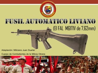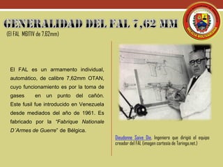 El documento describe el fusil automático liviano FAL de 7,62 mm, introducido en Venezuela en 1961 y utilizado en diversos conflictos globales. Destaca su funcionamiento por toma de gases en el cañón y su capacidad para disparar granadas, así como su adopción por varios ejércitos y conflictos históricos. Incluye instrucciones de manejo y mantenimiento del arma para garantizar su correcto uso y seguridad.