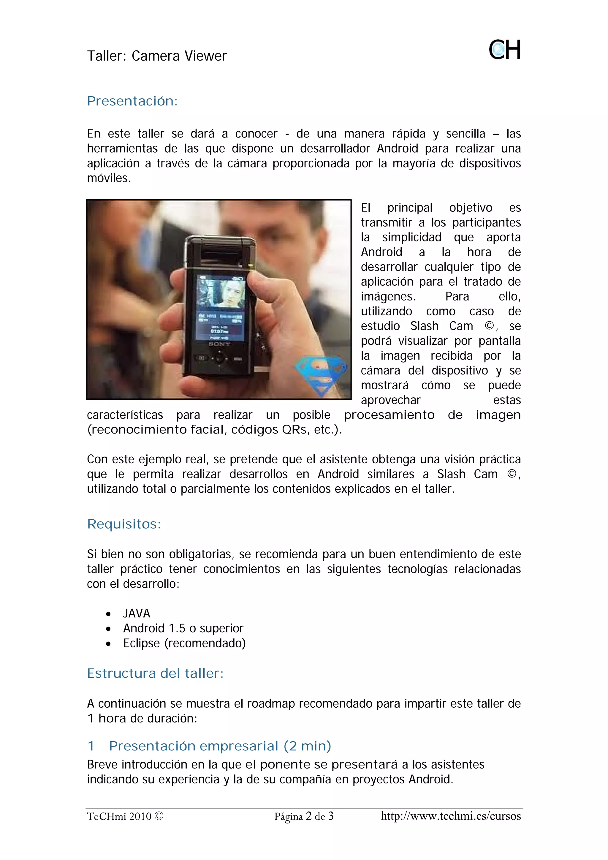 El taller 'Camera Viewer' presenta herramientas para desarrolladores Android centradas en la creación de aplicaciones que utilizan la cámara de dispositivos móviles. Utilizando el caso de estudio de 'Slash Cam ©', se enseñará a los participantes sobre el desarrollo práctico y funcionalidades como reconocimiento facial y códigos QR. El taller incluye introducciones, desarrollo de aplicaciones y una sesión de preguntas, con recomendaciones previas de conocimientos en Java y Android.
