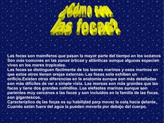 Las focas son mamíferos marinos que pasan la mayor parte del tiempo en los océanos, especialmente en las zonas árticas y atlánticas. Se distinguen de leones y osos marinos por no tener orejas externas y solo exhibir un orificio, aunque comparten similitudes anatómicas. Dentro de la familia de las focas existen diferentes especies que varían en tamaño, como las morsas que son más grandes y tienen colmillos, o los elefantes marinos que son gigantescos a pesar de ser parientes cercanos