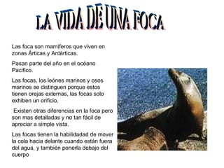 Las focas son mamíferos acuáticos que viven en zonas árticas y antárticas. Pueden permanecer sumergidas entre 5 a 20 minutos. Las hembras dan a luz crías cubiertas de pelo blanco y las amamantan, a diferencia de otros mamíferos, mediante la presión de su hocico sobre las glándulas mamarias de la madre. Existen 19 especies de focas, entre las más comunes están la foca común, la foca ocelada, la foca gris y la foca de Ross.