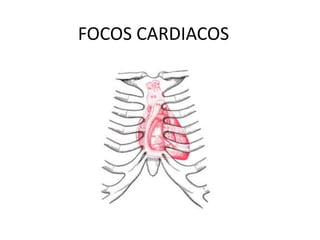Los focos cardiacos son vibraciones producidas por el cierre de las válvulas cardiacas. El primer ruido (1R) se produce por el cierre de las válvulas aurículo-ventriculares al comienzo de la sístole ventricular, mientras que el segundo ruido (2R) se debe al cierre de las válvulas sigmoideas al comenzar la diástole. La auscultación cardiaca identifica cuatro focos principales para escuchar mejor los ruidos del corazón: aórtico, pulmonar, tricú
