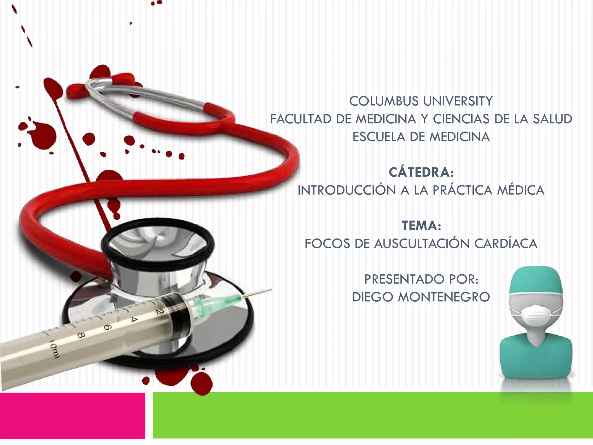 Este documento presenta los focos de auscultación cardíaca y las normas para una correcta auscultación cardíaca. Explica los cuatro focos principales de auscultación (mitral, aórtico, tricúspide y pulmonar), así como el foco aórtico accesorio. Además, describe las posiciones correctas del paciente y del médico durante la auscultación, la importancia de auscultar con respiración normal y sistemática, y la necesidad de un entrenamiento del oído para realizar conclusiones fundamentales