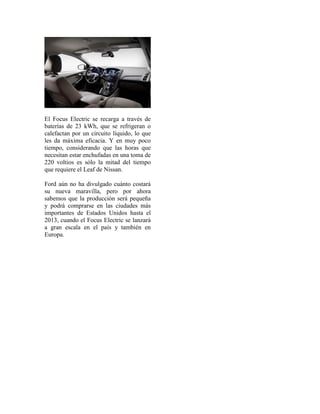 El Focus Electric es el primer coche eléctrico de Ford. Se presentará en el Salón de Detroit y llegará a las calles de Estados Unidos antes de fin de año. Tiene un alcance de 136 km y se recarga en 3-4 horas, la mitad del tiempo que el Nissan Leaf. Incluye características como pantalla táctil, MyFord Touch y Mobile MyFord.