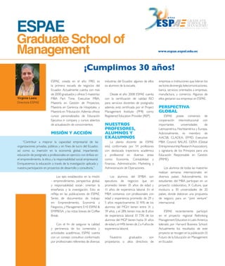 ESPAE, fundada en 1983, es la primera escuela de negocios del Ecuador, con más de 2000 graduados y ofrece diversas maestrías y cursos de educación ejecutiva. Su misión es mejorar la capacidad empresarial mediante educación de postgrado con enfoque en emprendimiento y responsabilidad social, apoyándose en investigación aplicada. Además, cuenta con certificaciones de calidad y convenios internacionales que potencian la formación global de sus estudiantes.
