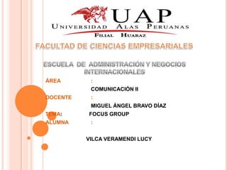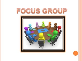 El focus group es un método de investigación cualitativa que consiste en reunir a un pequeño grupo de personas para discutir y generar opiniones sobre un tema específico, como un producto o servicio. El moderador guía la discusión usando preguntas para estimular la participación del grupo. El asistente del moderador toma notas de la discusión. Los focus groups proveen información cualitativa valiosa sobre las percepciones y actitudes de los usuarios y consumidores.