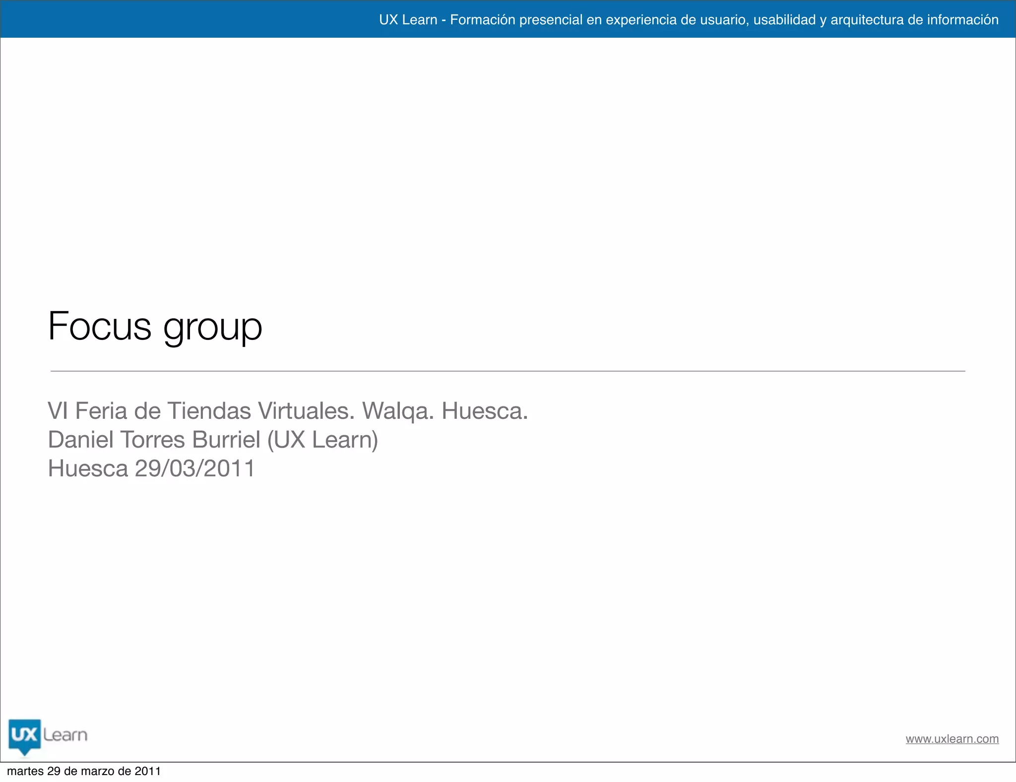 El documento proporciona información sobre los focus groups. Explica que un focus group es una reunión de 6-10 usuarios dirigida por un moderador para obtener opiniones sobre un sitio web y mejorar su usabilidad. Detalla cómo planificar un focus group, incluyendo la determinación de objetivos, la selección de participantes, y la guía para llevar a cabo la discusión y registrar las conclusiones. El propósito es validar el diseño y mejorar la experiencia del usuario.