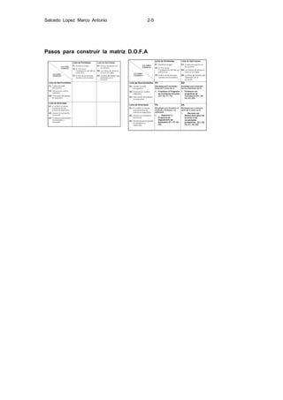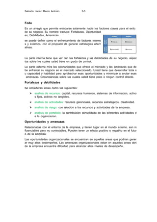 Este documento describe la matriz FODA, un método para analizar las fortalezas, oportunidades, debilidades y amenazas de un negocio. La matriz FODA permite enfocarse en los factores clave internos y externos para el éxito de un negocio. La parte interna incluye fortalezas y debilidades sobre las cuales una empresa tiene cierto control, mientras la parte externa considera oportunidades y amenazas del mercado sobre las cuales una empresa tiene poco control.